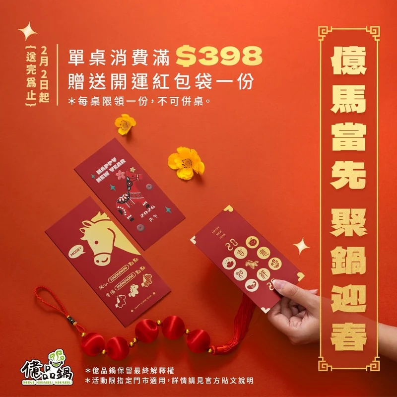 好禮放送: 單桌消費滿 $398,即贈「開運紅包袋」乙份!