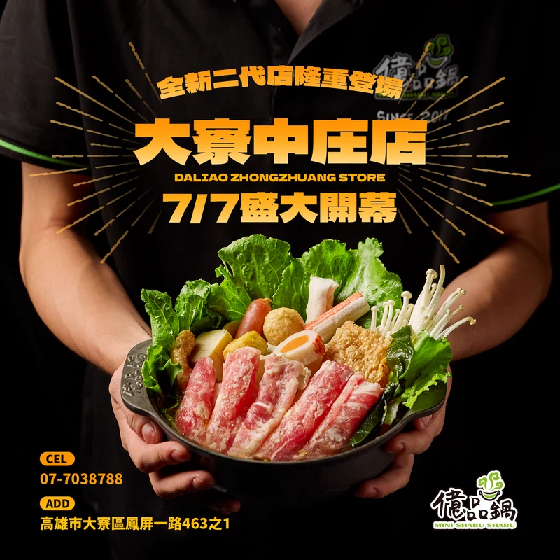 【 新店開幕 】高雄大寮中庄店 2025-08-20 【 億品鍋大寮中庄店 二代店新開幕!】#億品鍋 在高雄大寮升級登場『 億品鍋2.0 』全新二代店版本➤ 空間更寬敞,用餐不擁擠➤ 自助吧區域更大,動線更順更好拿➤ 裝潢全新升級,整體氛圍更舒適想坐得舒適、吃得豐富 就快來!多種鍋物只要170元起豐富自助吧讓你吃飽又吃好!-官方網站: yeepingo.com.tw分店一覽: yeepingo.com.tw/store- 億品鍋.大寮中庄店門市地址: 高雄市大寮區鳳屏一路463之1門市電話:07-7038788營業時間:11:00-23:00(最後收客22:00)-#億品鍋 #高CP值火鍋